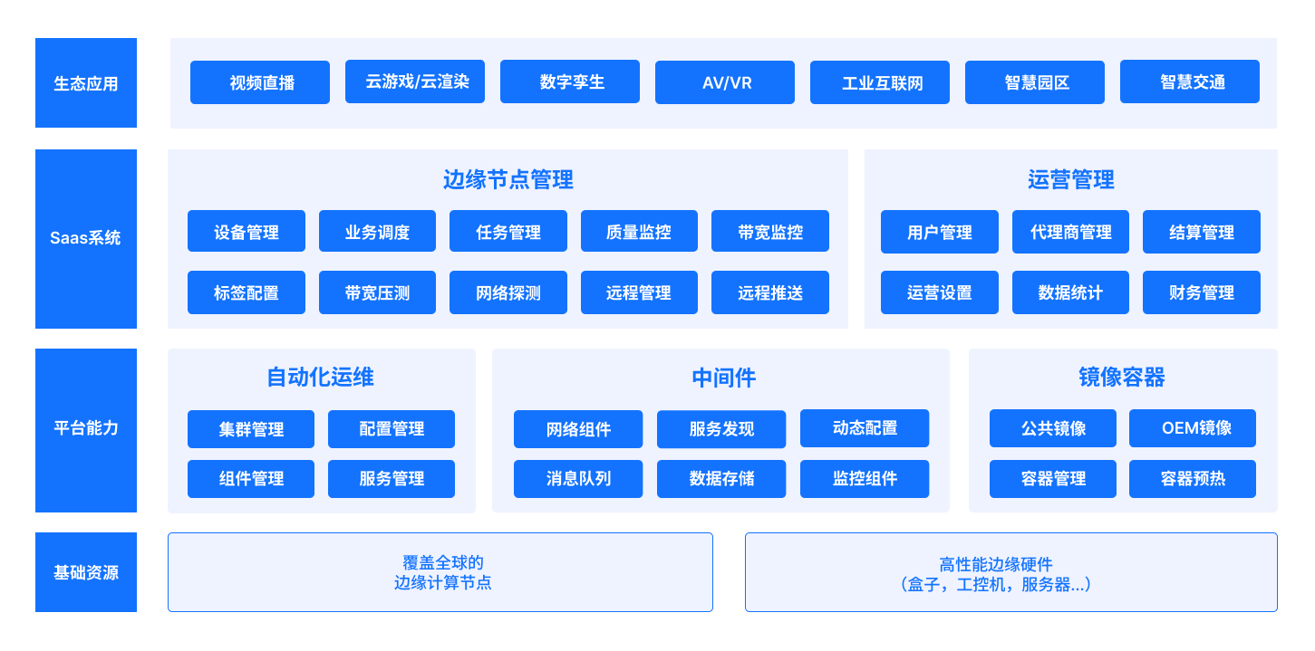 基于边点云全球边缘节点和网络构建,将计算能力下沉至边缘侧,软件提供包括边缘云节点管理,业务调度,数据管理,运维监控等功能